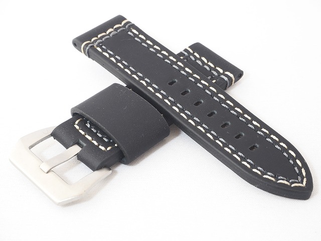 1997年に設立されたBANDA社 ヨーロッパ、アメリカなどの時計メーカーへの革ベルトを供給しているストラップメーカーです。 ビンテージタイプの牛革ダブルステッチが大きな特徴で個性的です。 パネライスタイル、大型時計に最適です。 裏材には、水や汗に強い牛革を使用しています。 【商品スペック】 素材:牛革カーフ 色:ブラック 取付幅 24mm仕様:時計側24mm/尾錠側24mm 26mm仕様:時計側26mm/尾錠側26mm 厚さ:約4mm 長さ:6時側115mm/12時側75mm その他:尾錠はフィッシュテールタイプ